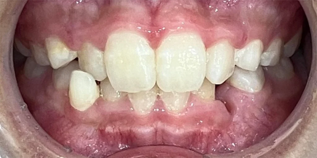 マウスピース矯正症例紹介 今回ご紹介する患者様は、前歯のがたつき(叢生)を気にされており永久歯が並ぶ為に必要なスペースよりも顎の大きさが小さい為、将来的に叢生が解消することは困難と予想され、拡大矯正装置により歯列弓を拡大することで永久歯交換スペースを確保しました。 現在、永久歯への交換期のため保定で経過観察中です。 治療前後の比較 術前:正面 術後:正面 術前:右側 術後:右側 術前:左側 術後:左側 術前:上顎 術後:上顎 術前:下顎 術後:下顎 主訴 前歯のがたつき(叢生)が気になる 治療期間 10ヶ月 治療費用 44万円(税込) 治療内容 前歯のがたつき(叢生)を気にされており永久歯が並ぶ為に必要なスペースよりも顎の大きさが小さい為、将来的に叢生が解消することは困難と予想され、拡大矯正装置により歯列弓を拡大することで永久歯交換スペースを確保しました。現在、永久歯への交換期のため保定で経過観察中です。 リスク・副作用 ・床拡大装置は装置の大きさから初めの数日は違和感と発音のしづらさがあるが数日で慣れることが多いです。・取り外し可能なので装着時間が重要になり患者様の協力度で矯正治療期間に大きく影響します、歯牙への適合も重要であるため、保護者の確認や管理が不可欠です。